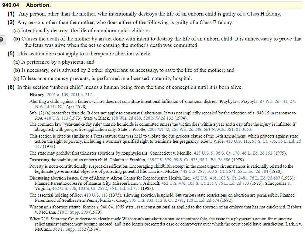 The sample question referenced Wisconsin Statute 940.04, so I did what all good voters should do and actually looked it up so I know exactly what they are referencing. Here is a screen shot of the actual statute.