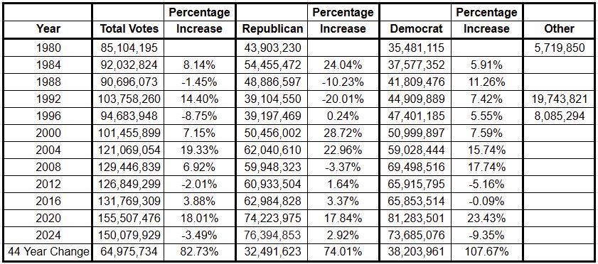 My observation on the spreadsheet calculations is that the Democratic Party has done a much better job at getting their base out to the polls to vote than the Republicans. Look at that 44 year increase in voter turnout, 108% increase for the Democrats and only 74% increase for Republicans. I’m glad that we’ve had a 83% overall increase in voters over the last 44 years but that is NOT enough, we really need over an 80% (preferably over 90%) voter turnout of eligible legal voters to really access the direction the general population wants to steer the country. We can and we must do better!