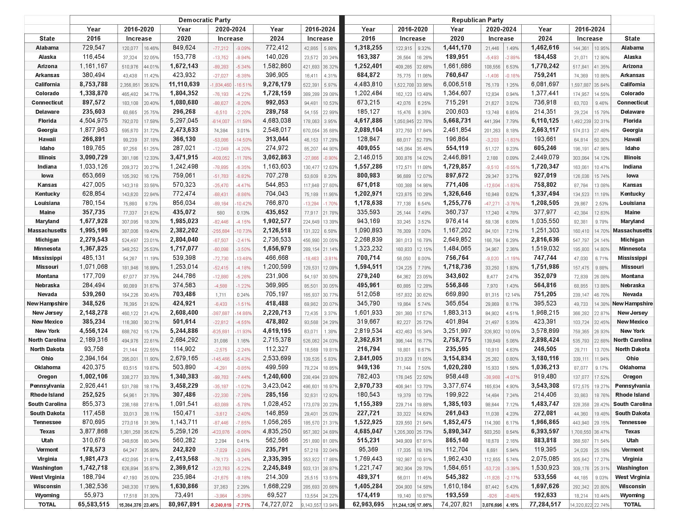 Below is a graphic of a spreadsheet containing vote totals for each state for the 2016, 2020, and 2024 Presidential elections. I have included the increase in vote totals for each state, the values in red are negative increases aka decrease in votes.