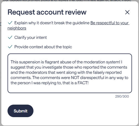 I’ve been suspended from Nextdoor for a month, here is the notice I received…