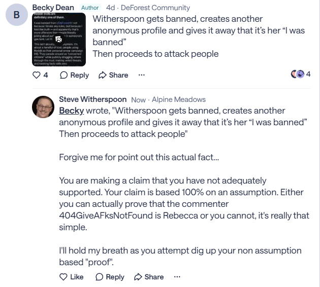 Becky’s post included three screenshots of comments posted on Reddit from an anonymous commenter named “404GiveAFksNotFound” and none of them were proof of what Becky was claiming, her accusations were based on assumptions. Becky doesn’t seem to fully understand that “Correlation ≠ Causation”, instead she seems to think that an accusation is proof enough, aka guilty until proven innocent. My reply to Becky above was reported as “Non-local topic outside of a group”, here is the appeal I submitted that was subsequently denied…