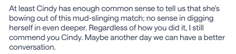 In a reply to someone else’s comment shortly after Cindy’s “waste my time” comment above, I commended Cindy for bowing out of the mud slinging regardless of the uncivil and disrespectful method she used to do it and I offered her an olive branch for the future…