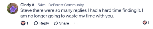 - In the second comment; Cindy literally tells me to “butt out”, this was intentionally uncivil rhetoric. What did I do when faced with intentional uncivil rhetoric directed at me, I respectfully questioned her use of “butt out”, and then I respectfully and honestly addressed the thesis of her comment which was “why are you even commenting on this thread”. I provided a thorough explanation of why what goes on in DeForest concerns me and I even went as far as to explain that my explanation also applied to her. Then I clearly and honestly addressed her bad attitude and lack of logic regarding her trying to insert her pompous (pompous: affectedly and irritatingly grand, solemn, or self-important) judgement on what concerns me, and I specifically emphasized the difference between me and her. Considering the genuine lack of respect shown in her last sentence, I think my reply was reasonably respectful and written with firm resolve. Cindy’s comment was disrespectful and uncivil and yet her disrespectful and uncivil comment is allowed to remain posted on Nextdoor while my reply to her nonsense is deleted and used as false justification for suspension.