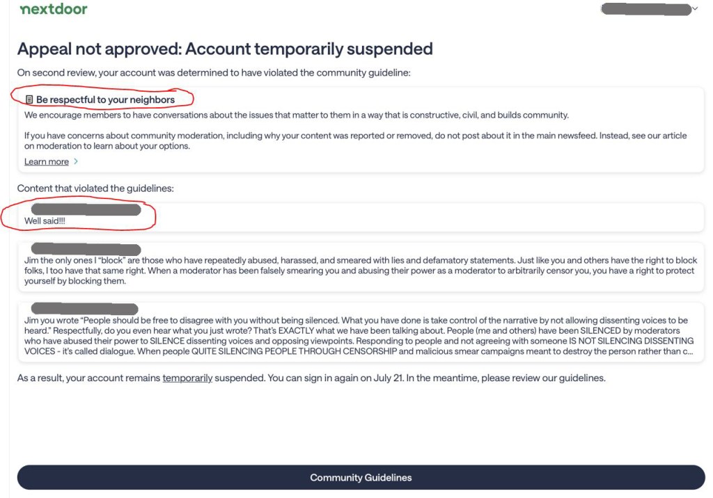 Yup, that’s it, two complementary words and the hate filled mob trying to silence everything that my sister posts on Nextdoor voted it down as being disrespectful.